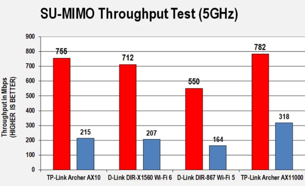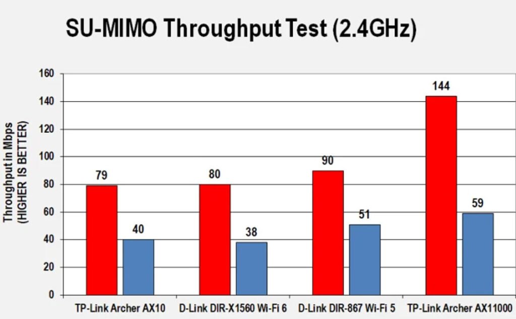 In this performance test, I pitted it against the similarly priced D-Link DIR-867 and the more high-end Wi-Fi 6 gaming router TP-Link Archer AX11000. In the 2. 4GHz throughput performance In my 2.4GHz throughput no surprise here in same-room testing, the Archer AX10’s speed came in at 79Mbps, about the same with the DIR-X1560 (80Mbps) but 11Mbps slower than the DIR-867 (90Mbps). The Archer AX11000 bested them all with a speed of 144 Mbps. At 30 feet (9 meters), the Archer AX10 scored 40 Mbps, slightly edging out the DIR-X1560 (38 Mbps), but being slower than the DIR-867 (51 Mbps) and AX11000 (59 Mbps).