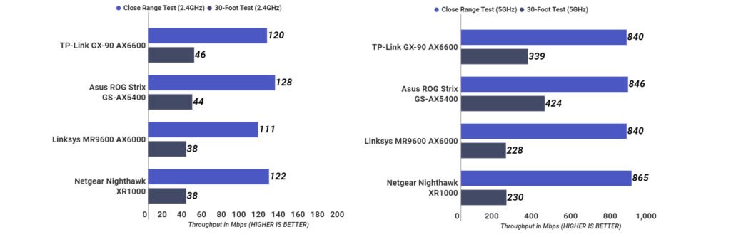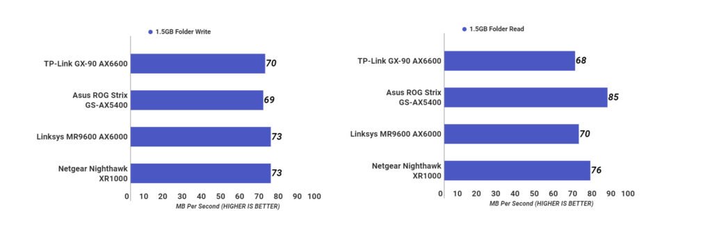 The TP-Link Archer GX90 score of 68MBps on the read test was the slowest of the bunch. The Linksys MR9600 scored 70MBps, the Netgear Nighthawk XR1000 scored 76MBps, and the Asus ROG Strix GS-AX6000 notched a speedy 85MBps.